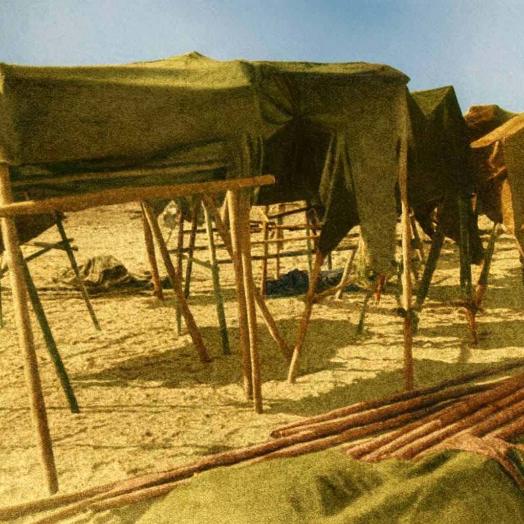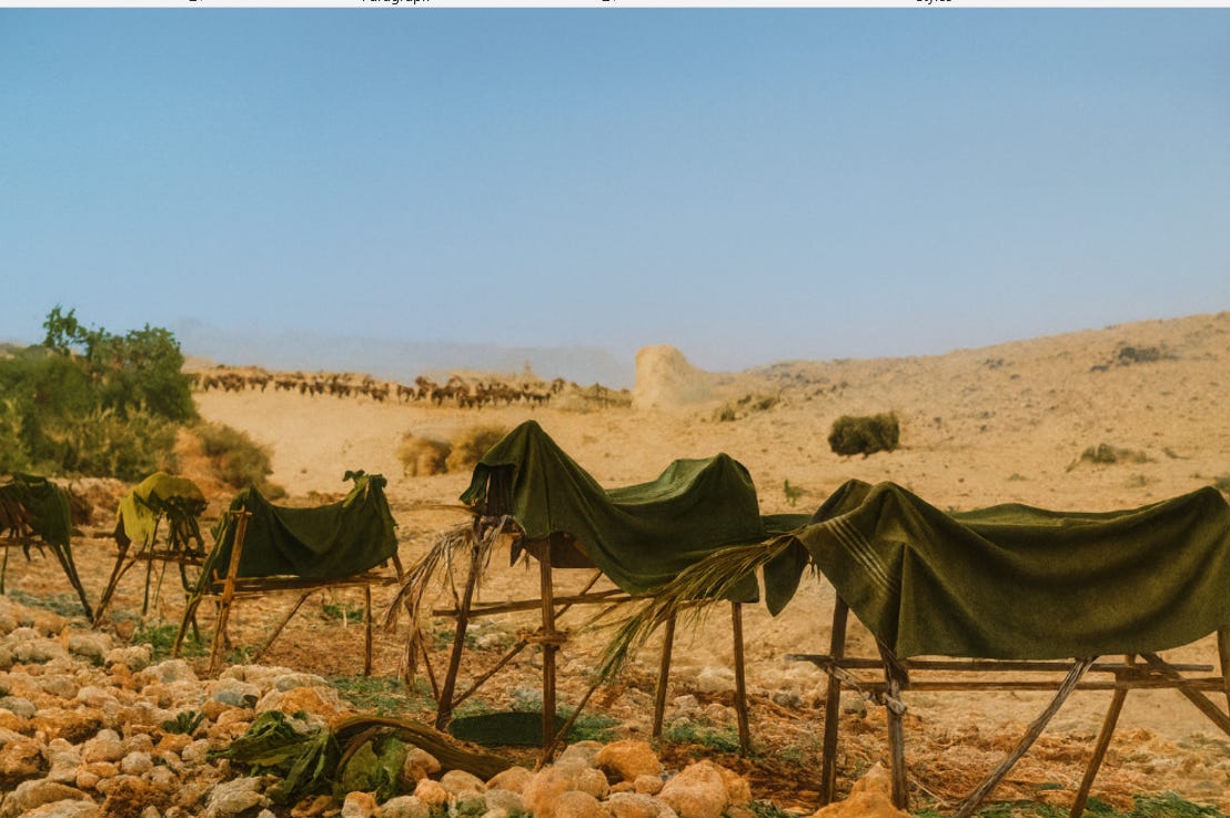 Below are the same photo and other photographs of the fake “horse line” constructed from sticks and blankets, colored-enhanced by AI: