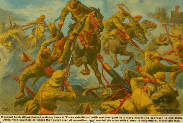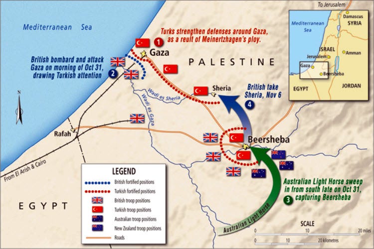 A British intelligence officer developed a clever gambit to draw Turkish forces away from their Beersheba base. Col. Richard Meinertzhagen devised and executed the “Haversack Ruse,” in which he rode near a Turkish mounted patrol near Gaza. The horsemen chased him, firing at the British military courier. He slumped in his saddle as if wounded, “accidentally” dropped his haversack, and escaped. The Haversack was full of intelligence reports, money, and the rider’s personal papers. The official reports showed that the British-led forces would make another attempt to capture Gaza, all the while preparing an attack on Beersheba